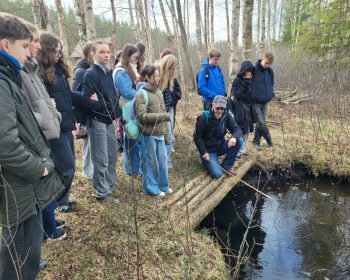 Balandžio 24 d. 7 klasės mokiniai leidosi į žygį su rašytoju, skaitomo romano ,,Kaukas Gugis ir kerų karas“ autoriumi, teisės profesoriumi Justinu Žilinsku po Sakiškių mišką. Žygis prasidėjo prie Sakiškių upelio ištakų, nustebinusios upelio akies. Vėliau mokiniams teko įveikti pelkę, kirtimus, kalvotus miško takelius, kol buvo pasiektas Neries…