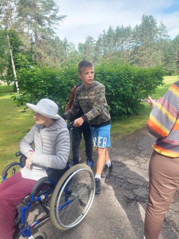 Vaikai vežiojo senolius vežimukuose, vedė pasivaikščioti, žaidė su jais žaidimus. Mokiniai džiaugėsi ir jautė pasididžiavimą, kad gali padėti.