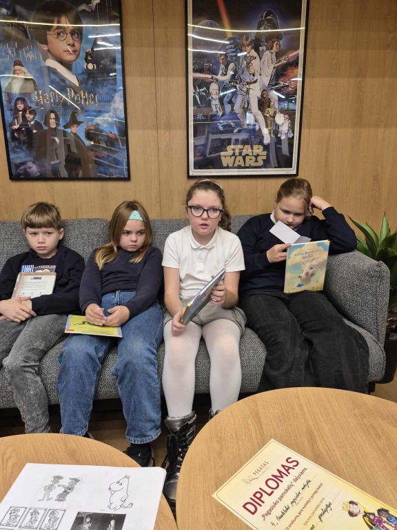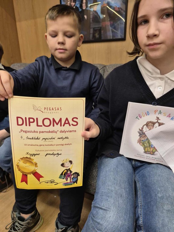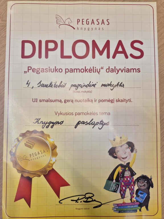 Už smalsumą, gerą nuotaiką, pomėgį skaityti bei savo perskaitytų knygų pristatymą mūsų mokyklos ketvirtokai buvo apdovanoti knygyno „Pegasas“ diplomu.