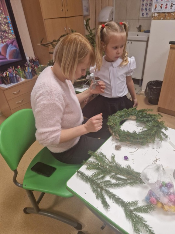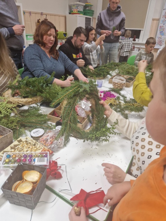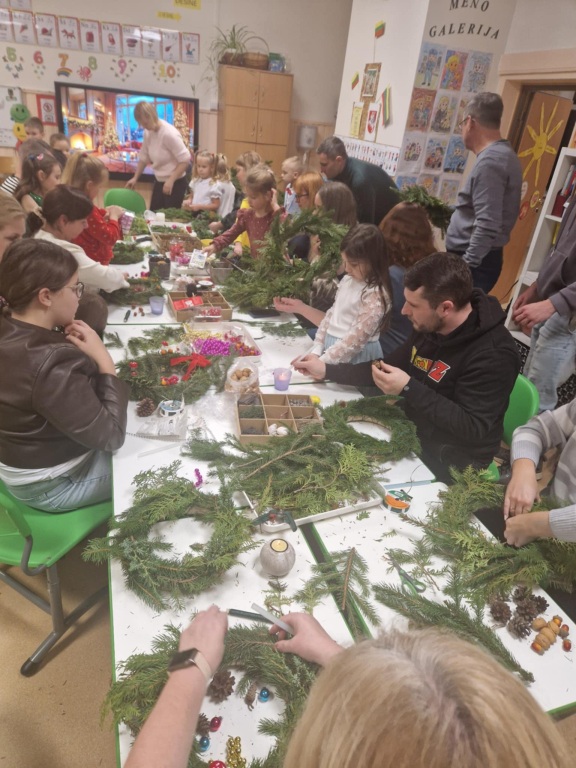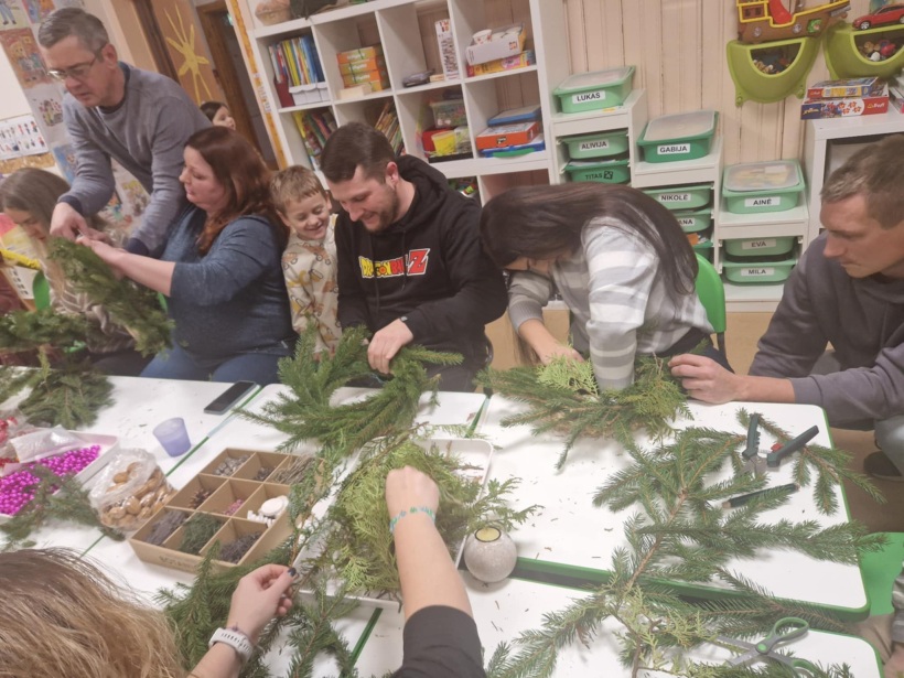Vakaronė prasidėjo kūrybinėmis dirbtuvėlėmis: tėvai kartu su vaikais pynė advento vainikus. Mažosios rankytės kruopščiai dėliojo šakeles, puošė jas žaismingais akcentais, o tėvai padėjo sukurti gražius ir prasmingus šio laikotarpio simbolius. Dirbtuvėlėse netrūko smagių pokalbių, juoko ir malonaus kūrybos šurmulio.