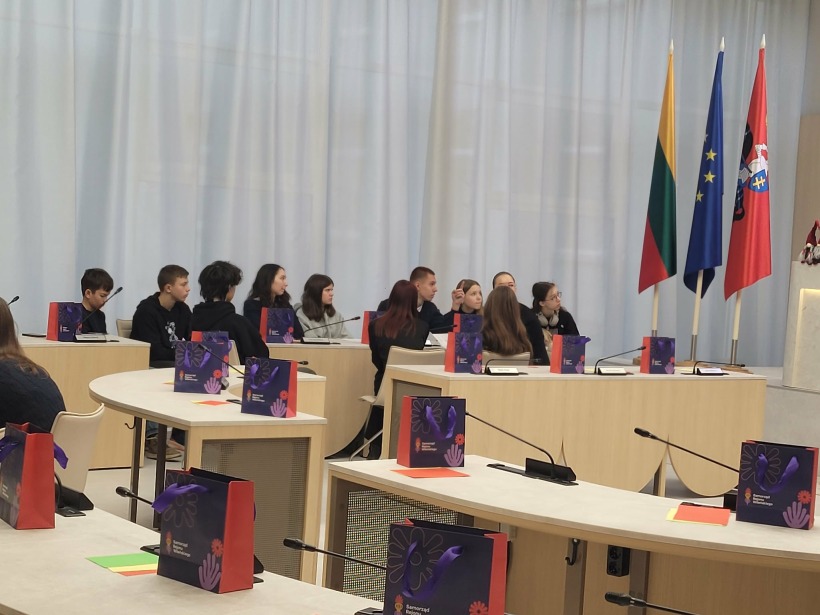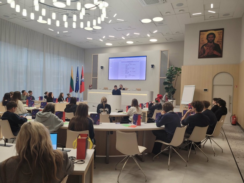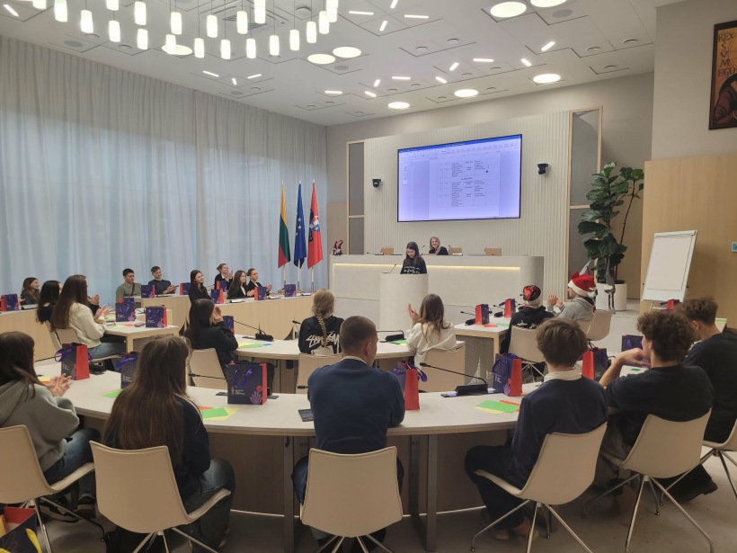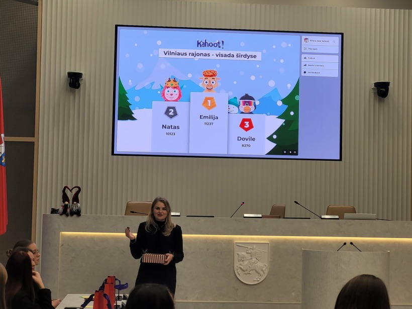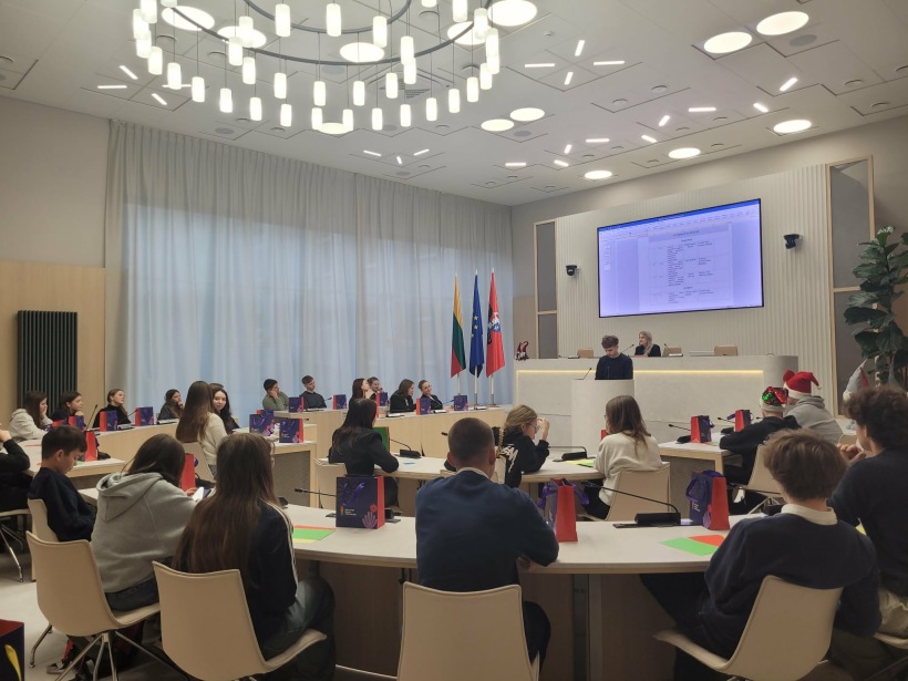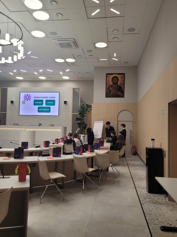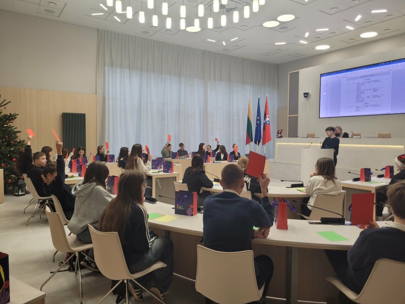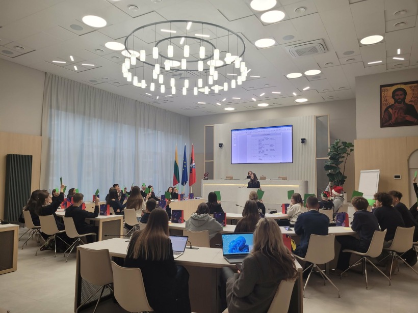 Vėliau viktorinoje nugalėję Dovilė, Emilija ir Natas tapo tarybos frakcijų sekretoriais Vilniaus rajono savivaldybės tarybos posėdžio simuliacijoje. Jie frakcijose suorganizavo pasiūlymų švietimo, sporto bei aplinkosaugos temomis teikimą tarybos svarstymui. Mokiniai pristatė savo siūlymus, kėlė klausimus, diskutavo, o vėliau balsavo.