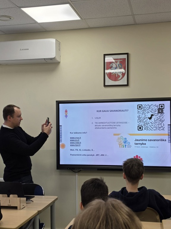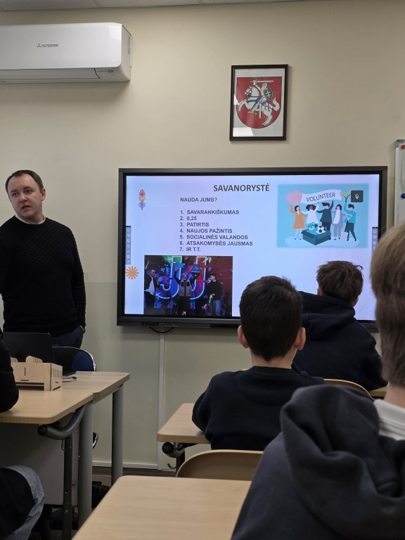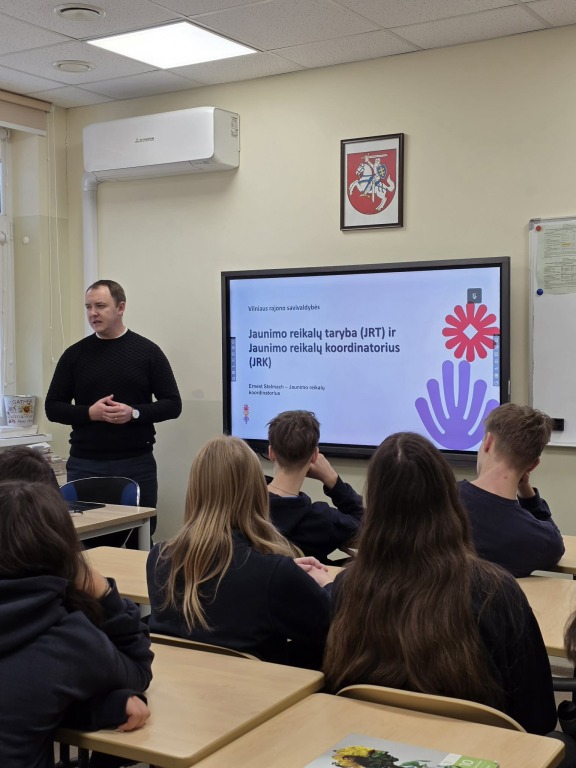 Sausio 27 d. mūsų mokykloje apsilankė Vilniaus rajono jaunimo reikalų tarybos koordinatorius Ernest Stelmach ir Vilniaus rajono savivaldybės jaunimo tarybos narė Justyna Belunska. Susitikime dalyvavo 8–10 klasių mokiniai.