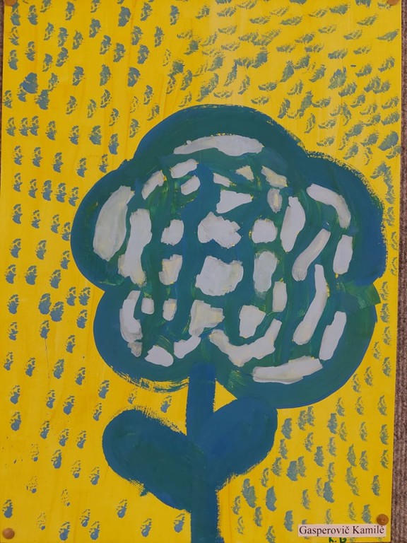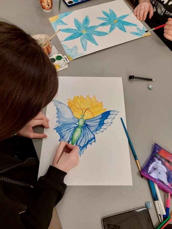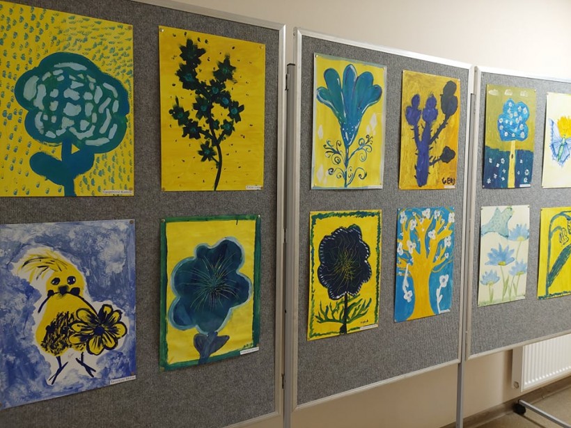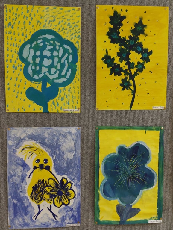 Mokykloje mokiniai piešė Lietuvos vardą įpindami į savo piešinius Ukrainos simbolius ir Ukrainos vėliavos spalvomis tapė pavasario gėles.